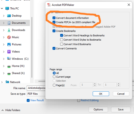 Du kan skapa en PDF/A-fil till exempel med Microsoft Word eller Adobe Acrobat Pro, som kan användas på IT-tjänsternas gemensamma enheter vid Konstuniversitetet (biblioteket, IT-klassen, lånad utrustning).